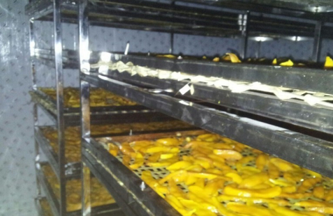 去皮切片:外皮必須去凈,因果皮中含有較多的單寧,如未削凈,在加工過程中容易產生褐變,影響成品色澤。去皮后的果實用鋒利刀片縱向切片,厚度約為8~10mm。芒果片護色期間添加白砂糖,一層芒果片一層砂糖,上面還要覆蓋一層砂糖。砂糖腌制時間不能太長,一般為8小時,過后抽出糖水,把糖水入鍋濃縮,再將果塊倒入糖水中,如果砂糖不夠還可以補加,使糖水濃度達到45%~60%。注意芒果片不能直接煮制。浸泡糖液初始溫度30左右為宜。浸漬過程的添加成份均要求符合食品衛生標準。將芒果片小心取出,瀝干水分后,均勻的擺在烘干托盤上,之后放入烘干房里干燥。一段:時間4H,溫度45,濕度控制在65%。二段:時間6H,溫度55,濕度控制在42%。第三段:時間2H,溫度62,濕度控制在26%。時間運行結束即可保證芒果干烘干完畢。