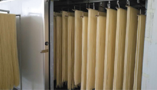 米粉的干燥工藝主要分自然晾曬干燥和烘烤干燥。老化后的米粉凝固較緊,因此在干燥前需用清水清洗,梳理整齊后放入烘烤架上烘烤。烘烤干燥要有專業(yè)的烘烤線,整個烘烤過程都在室內(nèi)進(jìn)行,并通過傳送帶流動烘干,烘烤間主要劃分成三個溫區(qū):低溫區(qū)、高溫區(qū)和冷卻區(qū)間。