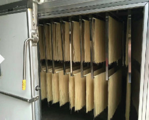 米粉如果放置形式為掛起來的,對風(fēng)路有影響,需要加裝軌道電機(jī)來使風(fēng)量和熱量更均均。否則,容易出現(xiàn)風(fēng)路前面的過干,而風(fēng)路尾端又還沒有干的情況。烘干過程中,宜以低溫大風(fēng)量為合適。過高的溫度,極容易出現(xiàn)斷粉。風(fēng)量不夠,傳熱不均,也是另外一個很重要的問題。另外,烘干后不要馬上拉出來,烘干房內(nèi)外溫差過大,極容易造成米粉卷曲變形,造成外觀缺陷。