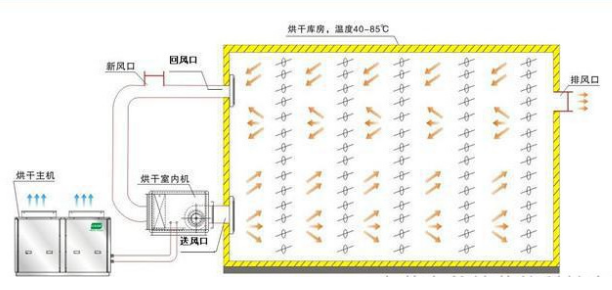 通過(guò)壓縮機(jī)做功,驅(qū)動(dòng)管路中的傳熱工質(zhì)吸收外界環(huán)境中的熱量(空氣中的熱量)在進(jìn)行壓縮做工使其變成高溫高壓氣體,再通過(guò)換熱裝置將熱量釋放到烘干房?jī)?nèi),通過(guò)熱風(fēng)循環(huán)系統(tǒng)進(jìn)行不斷烘干的過(guò)程。